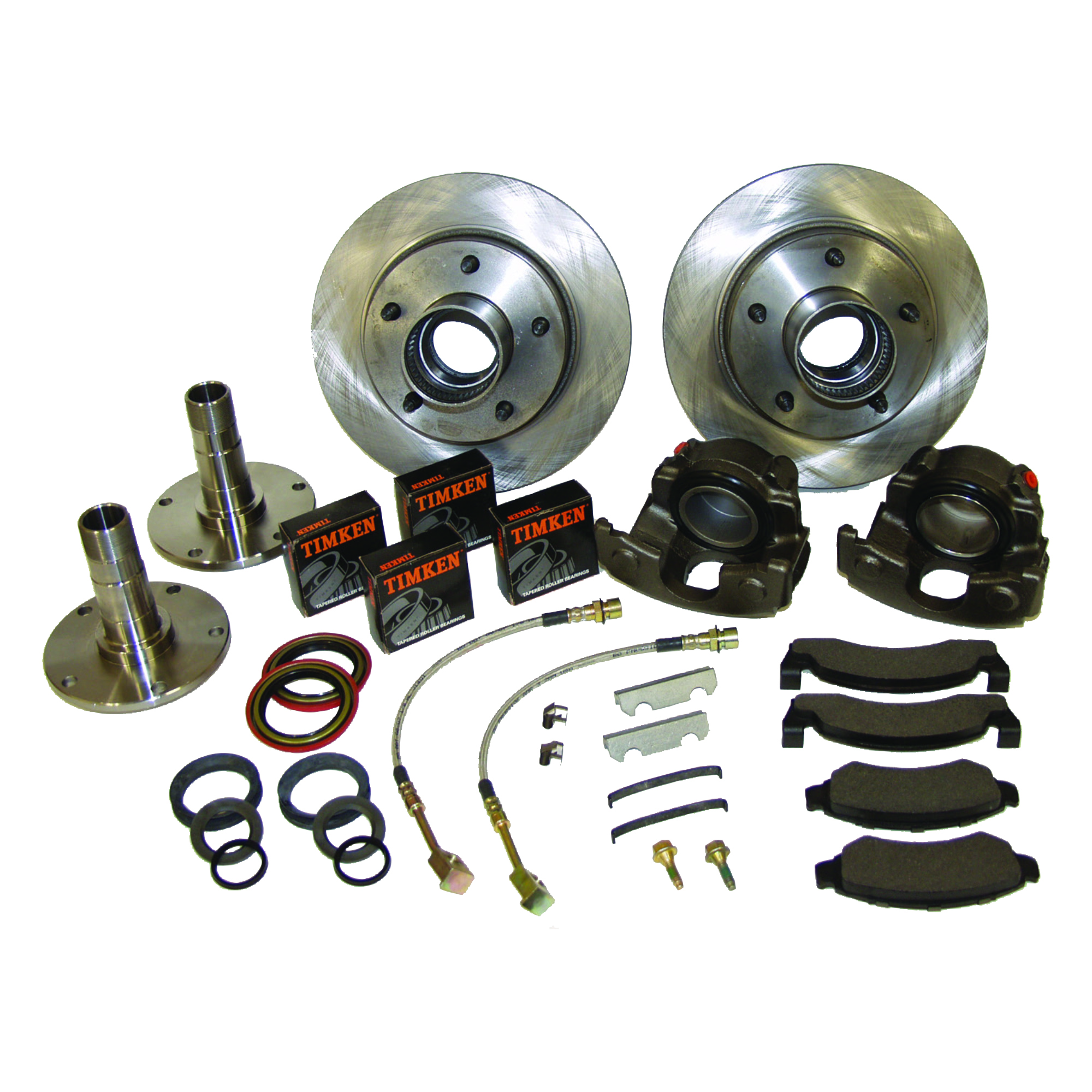 All-Inclusive Kit: Includes new spindles, bearings, races, seals, calipers, pads, caliper hardware, brake hoses, and pre-assembled hubs and rotors with new studs.