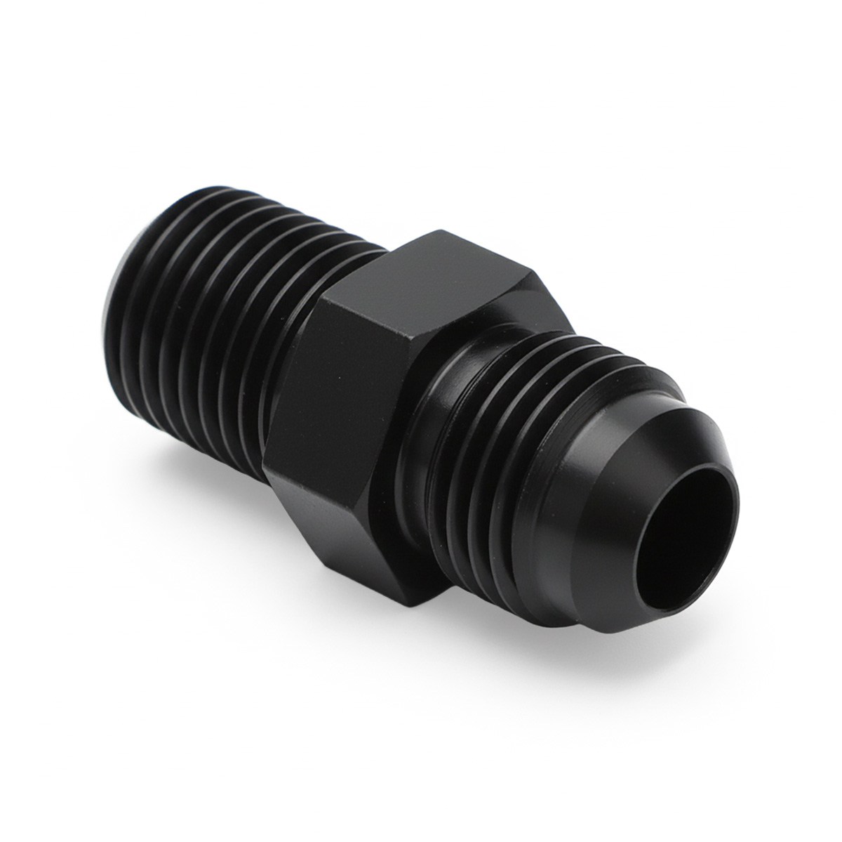 6AN to 1/4" NPT Adapter: Male 6AN flare fitting to male 1/4" NPT tapered pipe thread.