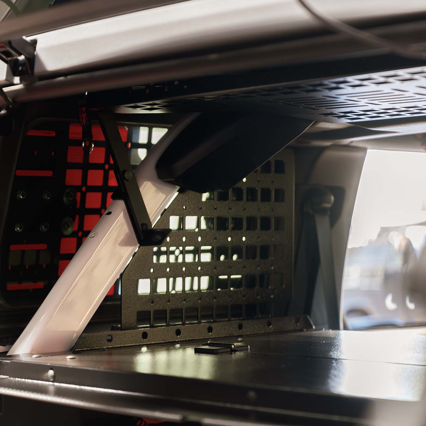 Enhance your Bronco's functionality with the Diabolical Roll Bar MOLLE Panels. These panels are a perfect addition to the Slipstream Security Enclosure, providing versatile and customizable storage options for your trail gear. Made from durable aluminum, these MOLLE panels are designed for a quick and easy 3-bolt installation, utilizing factory mounting locations and attaching directly to the Slipstream.
