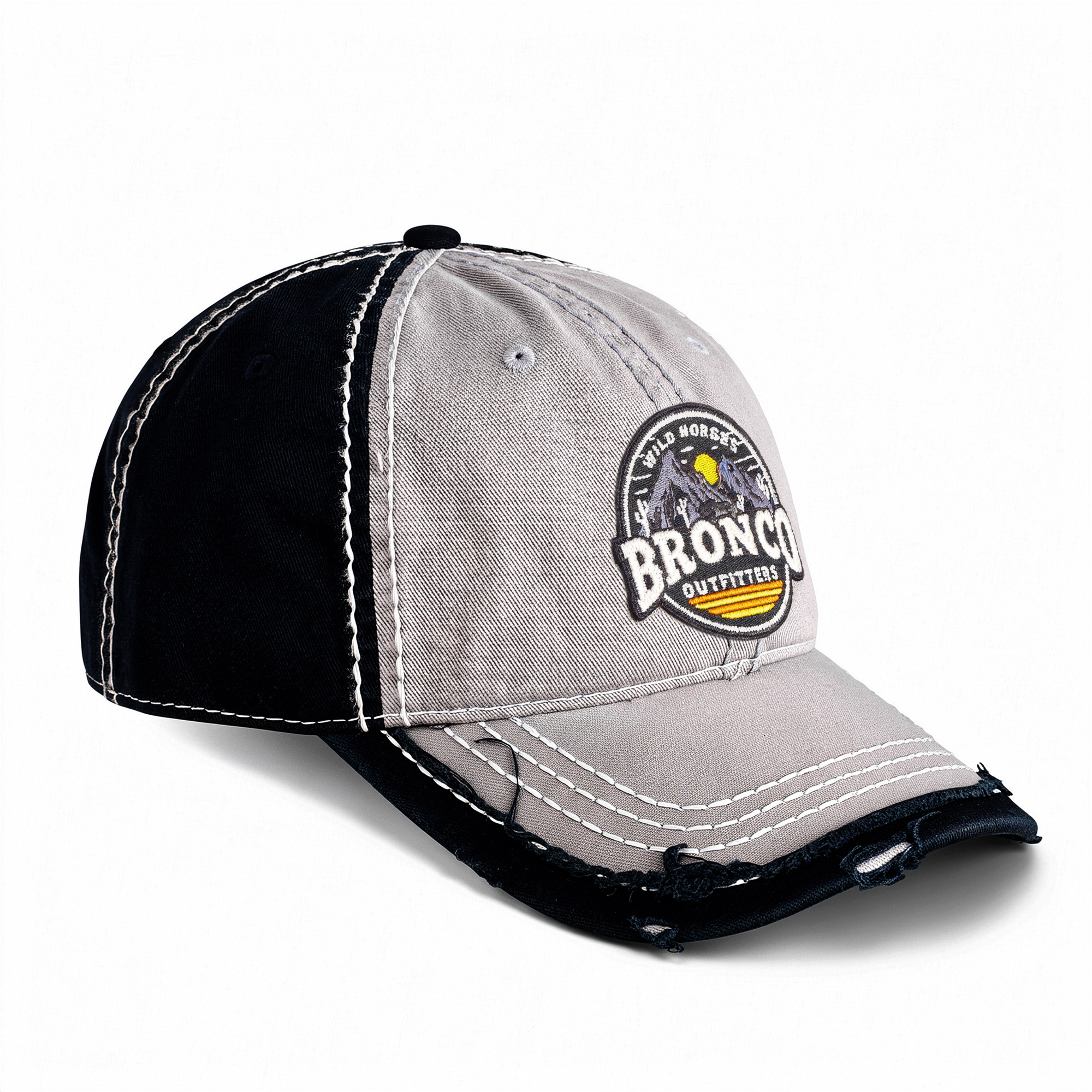 Pick up this distressed light gray and black hat with WILD HORSES Desert logo—made for everyday wear with a broken-in feel that fits right in with Bronco life.