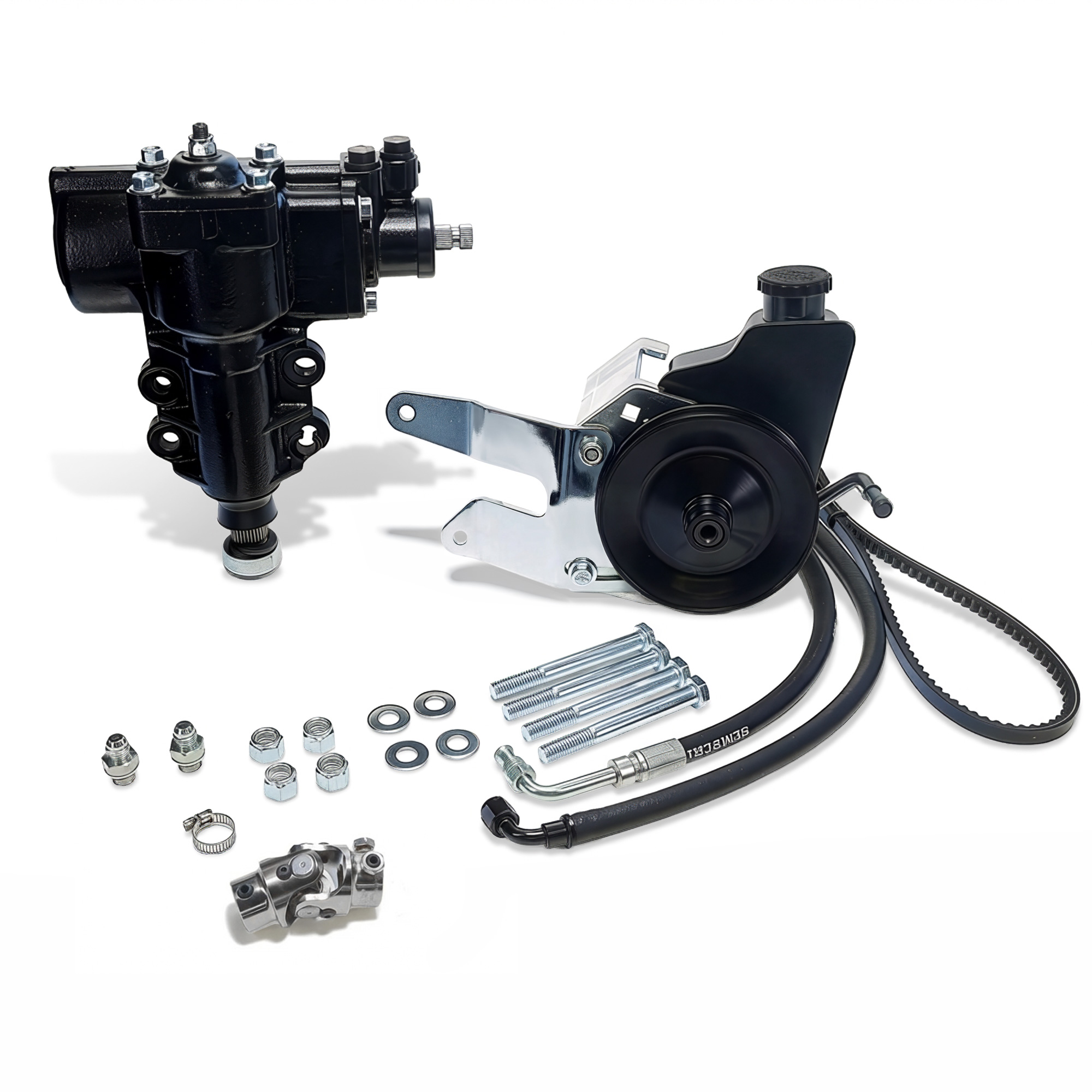 This custom power steering system features a brand new, 4-bolt quick ratio power steering box that bolts directly to the factory mounting holes in the frame.