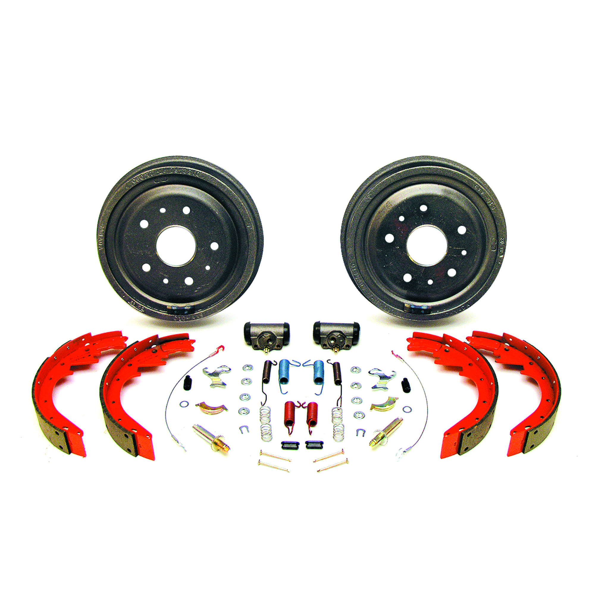 Each kit includes two new drums, shoes, right and left wheel cylinders, right and left self adjusters and spring kit.