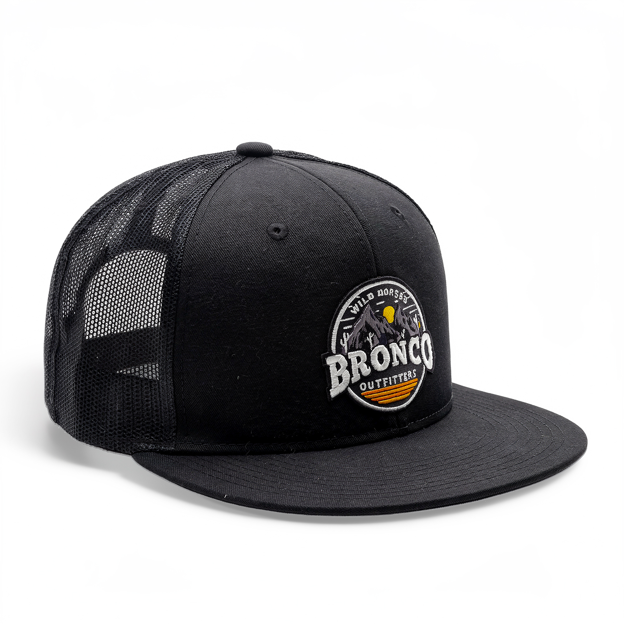 New WILD HORSES structured flat bill trucker hat built for airflow and long days, with a desert-inspired logo design that fits right in with Ford Bronco life.