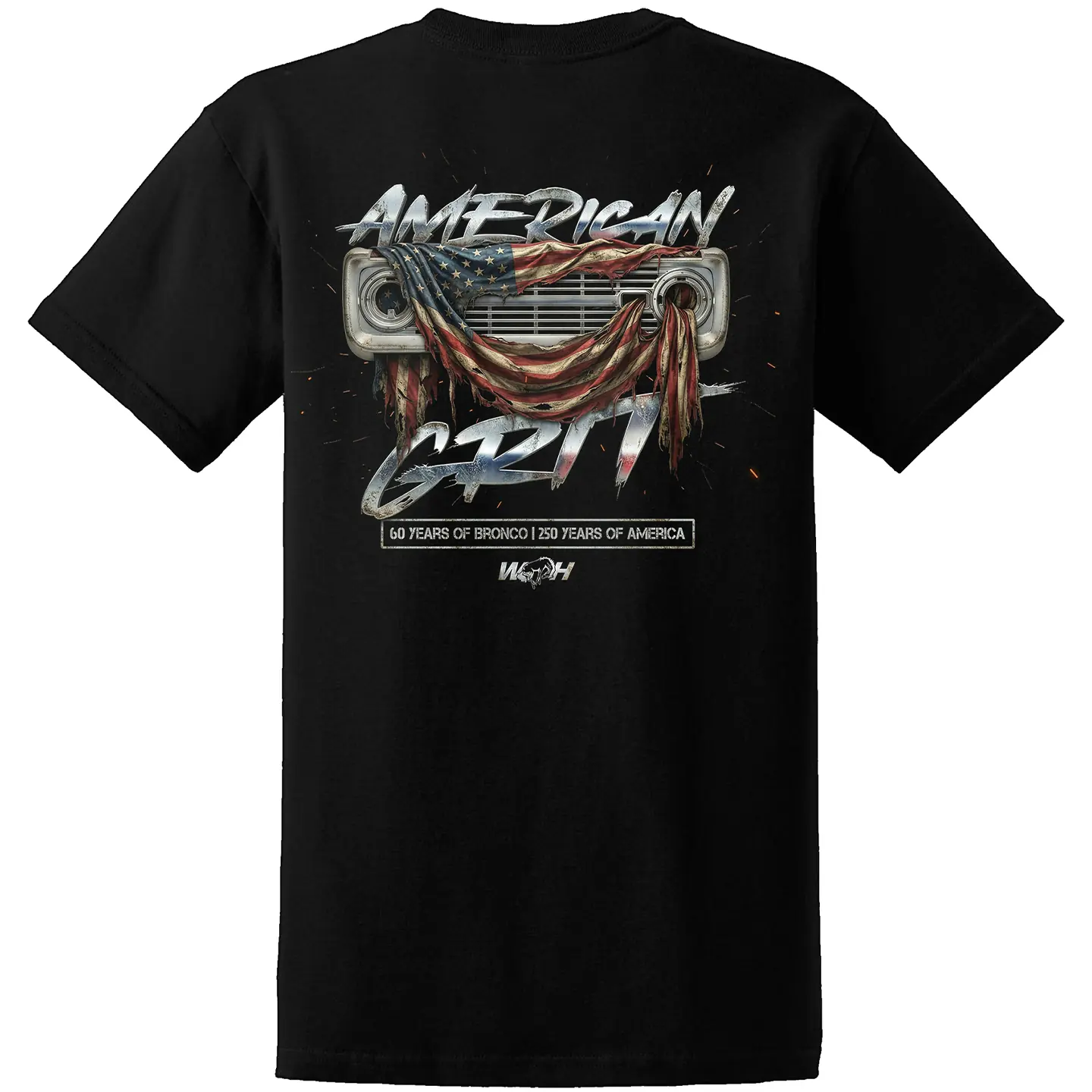 Built to honor two American milestones, the WILD HORSES American Grit T-Shirt celebrates 60 years of the Ford Bronco and 250 years of America with a bold, heritage-driven design. Featuring a classic Bronco grille wrapped in the American flag, this black tee represents the toughness, independence, and trail-born spirit that define both the Bronco legacy and the country it was built in.